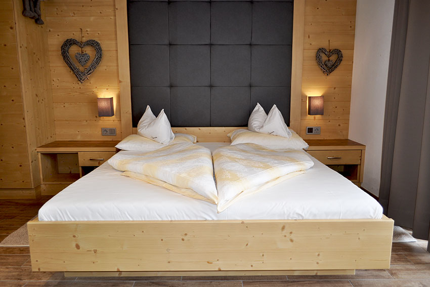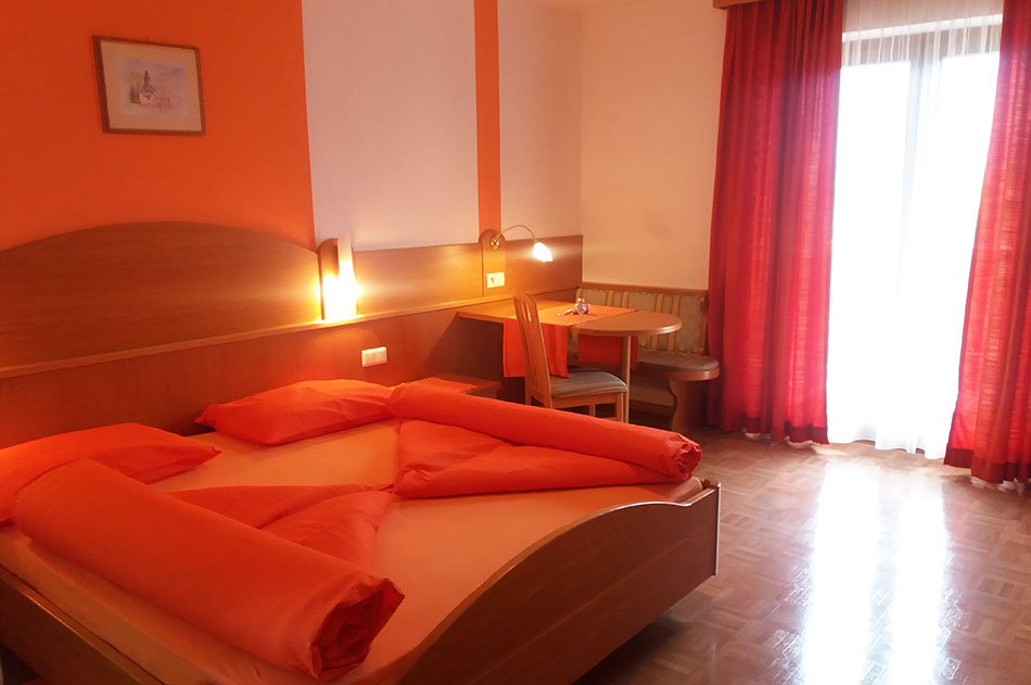 Bedroom, shower/toilet, TV, corner sitting area, balcony with panoramic view of Merano and surroundings.